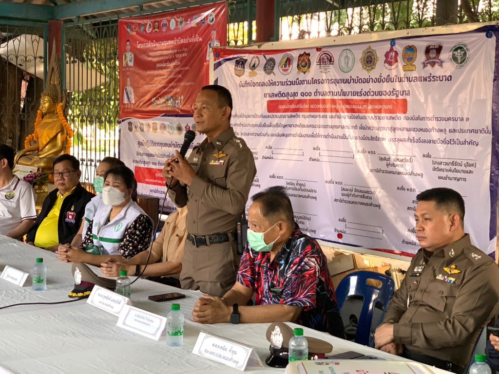 พ.ต.อ.สุขสันต์ แสนสวัสดิ์ ผกก.สน.หนองค้างพลู ประธานในพิธีลงนาม MOU – โครงการชุมชนบำบัดอย่างยั่งยืนในตำบลแพร่ยาเสพติดสูงสุด100ตำบล ตามนโยบายเร่งด่วนของรัฐบาล (Quick Win)